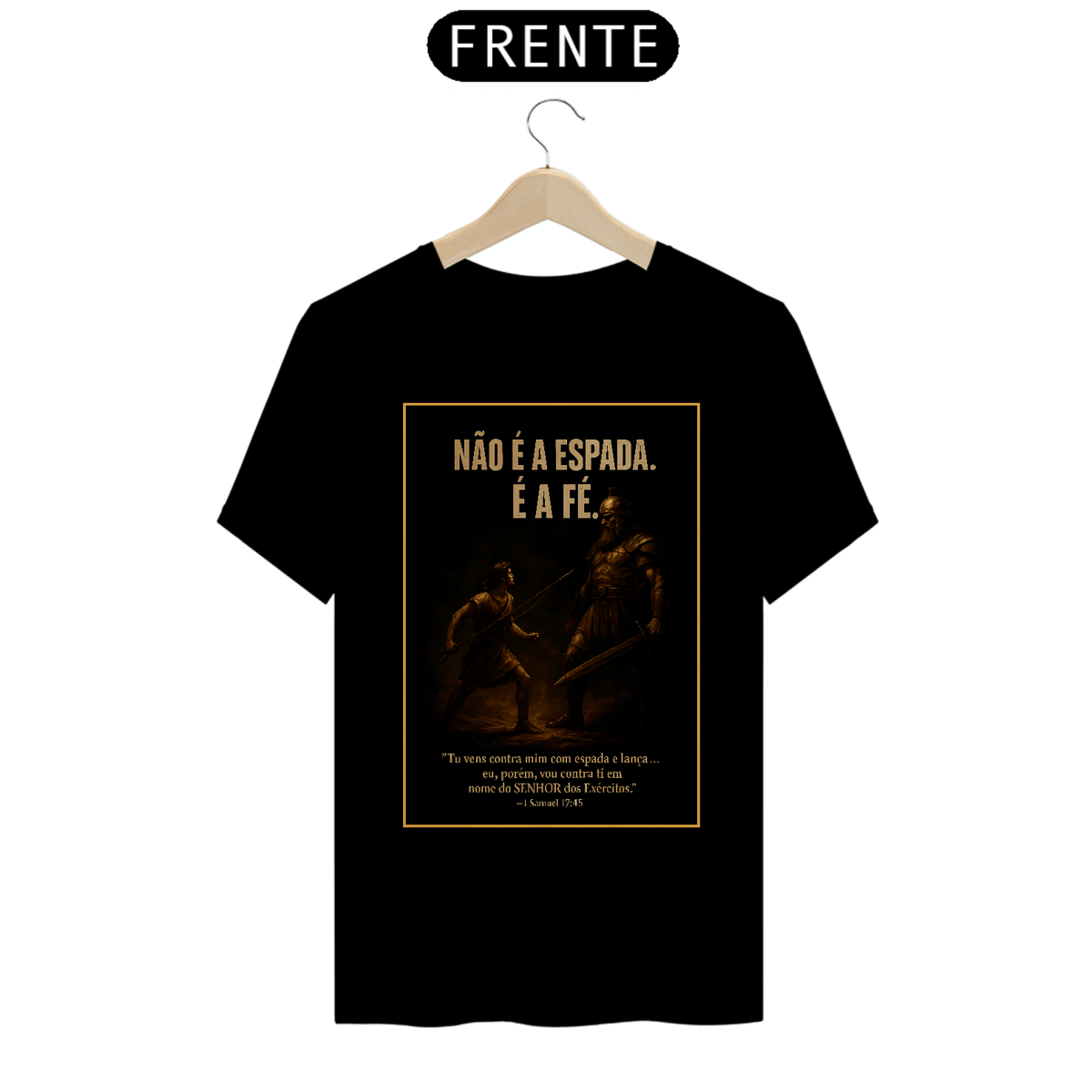 A estampa "Não É a Espada. É a Fé." traz a poderosa cena de Davi enfrentando Golias — um símbolo eterno da coragem que nasce da confiança em Deus, e não no poder humano.