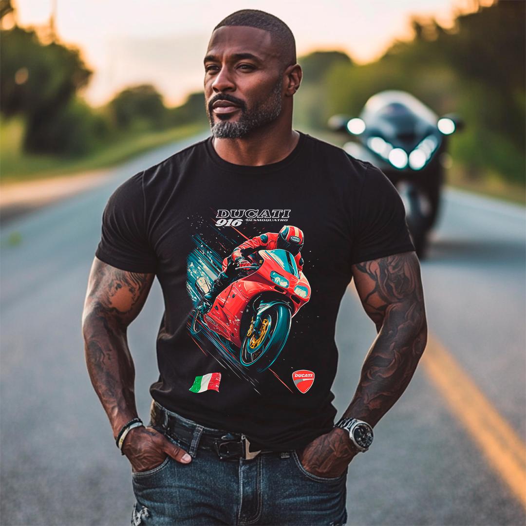 Estilo, velocidade e a paixão italiana, estampados no peito. A Ducati 916 é uma obra de arte das pistas, e esta camiseta transmite toda a emoção e elegância de uma verdadeira campeã mundial. Perfeita para quem não abre mão do design aliado à performance.