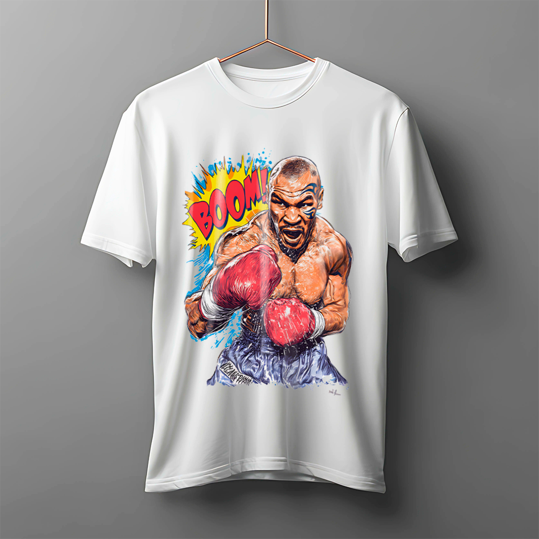 Da frase lendária — “Todo mundo tem um plano até levar um soco no rosto” — ao rugido explosivo de “BOOM!”, esta coleção captura o impacto bruto de Iron Mike. Seja no traço de HQ, no pôster granulado preto-e-branco ou no splash pop art, cada estampa traz a ferocidade inconfundível de quem foi temido antes mesmo do primeiro gongo.